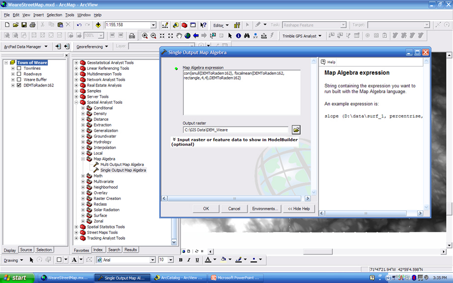 The Remedy: Applying a Map Algebra expression from the Single Output Map Algebra tool of the Map Algebra Toolbox under the Spatial Analyst Tools fixes the gaps composed of "nodata" between the spatial extents of the imported DEMs. Obviously, the Spatial Analyst license is required in order to perform this. The expression used in this instance is: con(snull(DEMToRadem162), focalmean(DEMToRadem162, rectangle,4,4),DEMToRadem162)where DEMToRadem162 is the name of my layer that contains the mosaicked DEM raster. DEM_Weare is the name I have chosen to contain the results of this gap cleanup. | ||